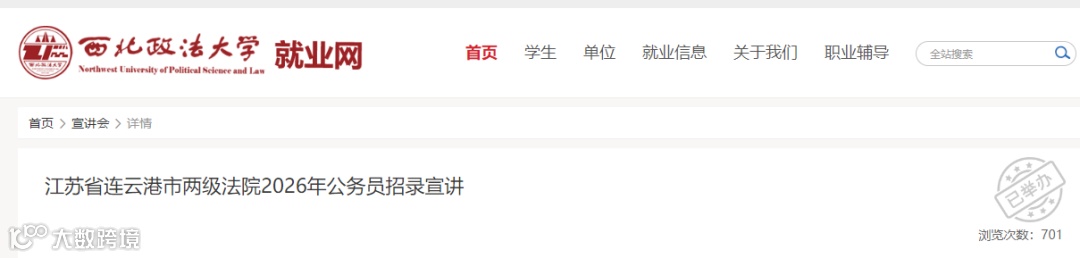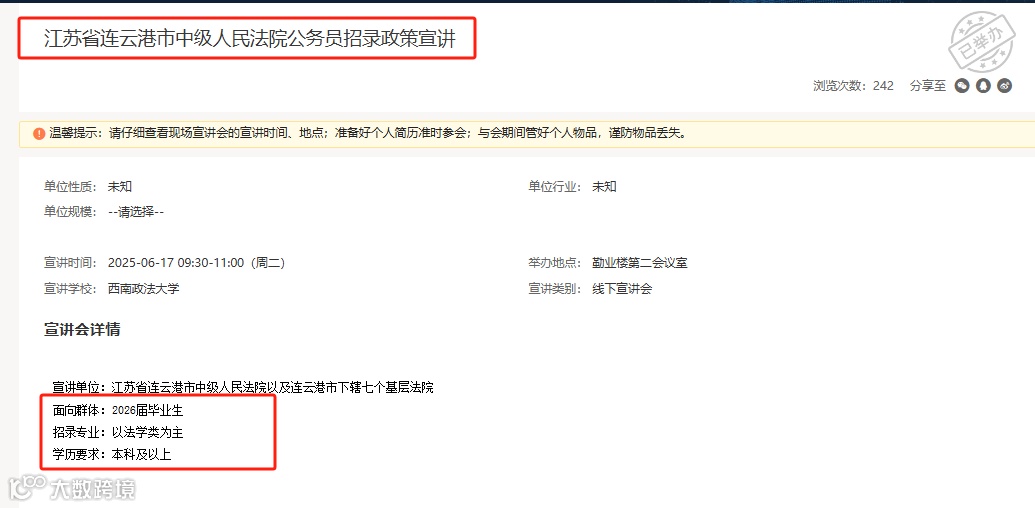 6月17日,西南政法大学就业信息网发布《江苏省连云港市中级人民法院公务员招录政策宣讲》信息,主要面向2026届本科及以上毕业生(以法学专业为主)进行2026招考宣传。