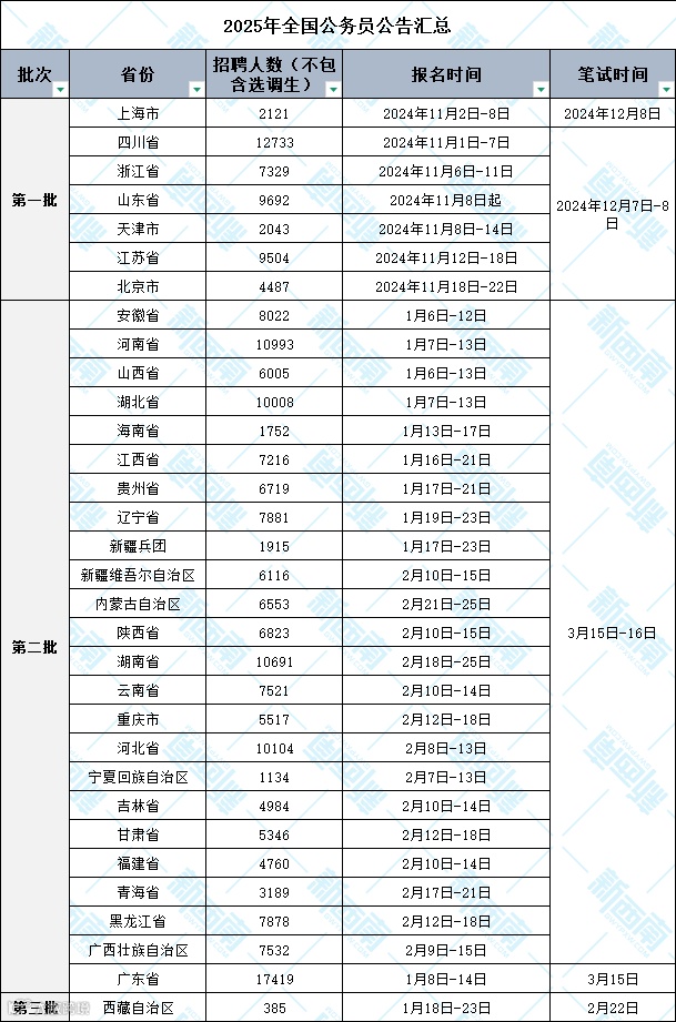 四川、江苏、北京等地作为第一批,一般11月出公告,笔试在12月中上旬,按照往年来看,这一批次招录人数接近5万人,愿意异地的同学也可以考虑这些城市。