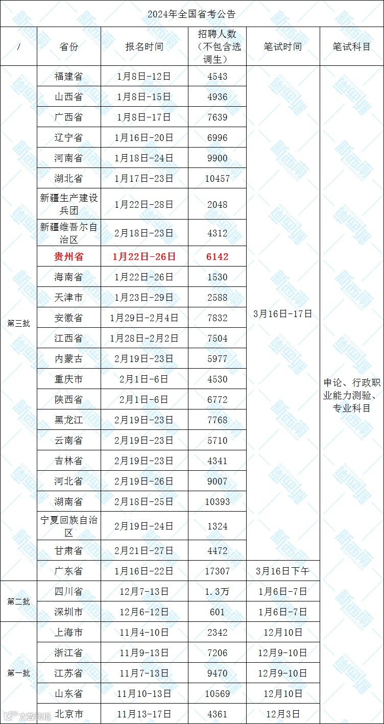24年四川省考共招录1.3万人,笔试时间为1月6-7日,根据上图这个时间点推测,很可能11月发布公告,12月笔试,这个时间相比往年有所提前,作为贵州的邻近省份,同学们也是值得考虑的。