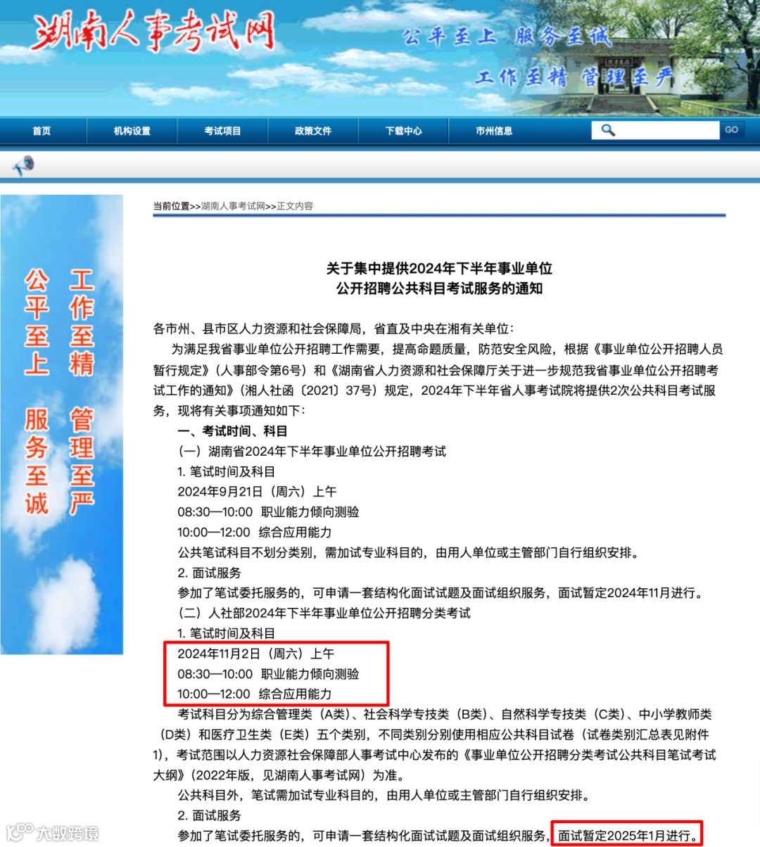 6月24日,湖南人事考试网发布了《关于集中提供2024年下半年事业单位公开招聘公共科目考试服务的通知》。通知中明确指出了人社部对2024年下半年事业单位公开招聘分类考试的笔试时间及科目安排的具体详情(如图)。