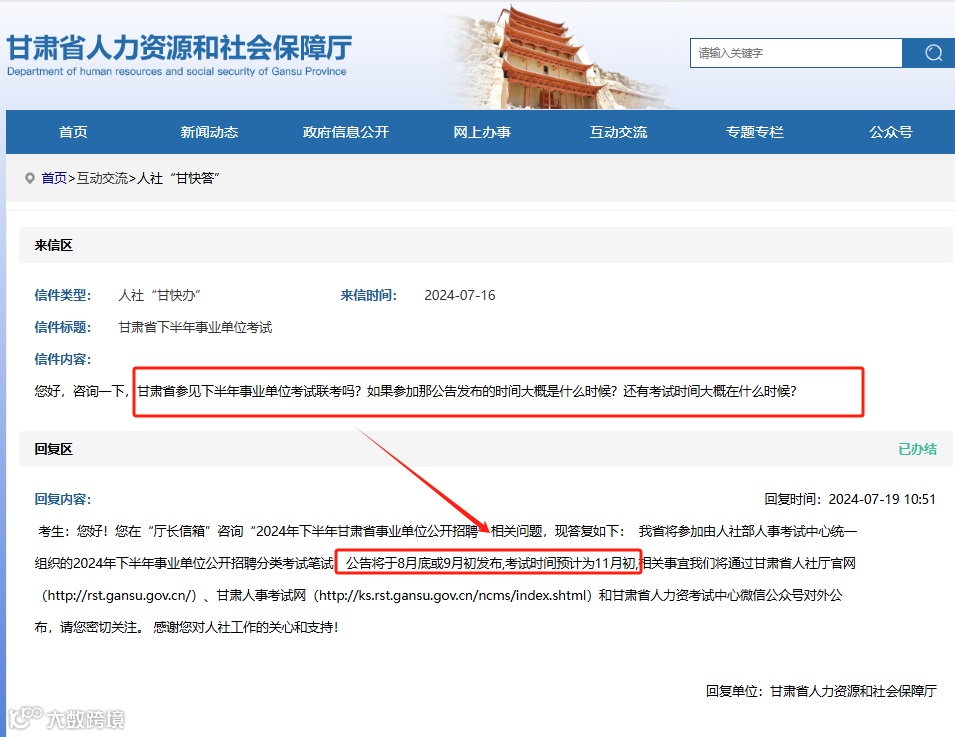 无独有偶,上周五,考生问及下半年事业单位考试什么时间?甘肃人社厅明确回复:8月底9月初出公告,考试时间预计为11月初笔试。