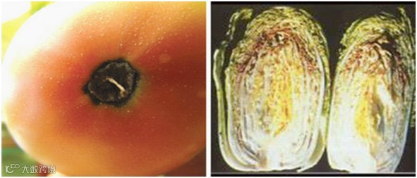 植物缺钙症状:顶芽、侧芽、根尖等分生组织易腐烂死亡,叶尖弯钩状,并相互粘连,干烧心、筋腐、脐腐等。