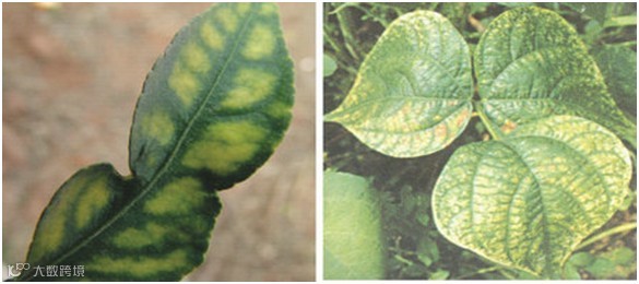 植物缺锰症状:症状从新叶开始,叶片脉间失绿,叶脉仍为绿色,叶片上出现褐色或灰色斑点,逐渐连成条状,严重时叶色失绿并坏死。