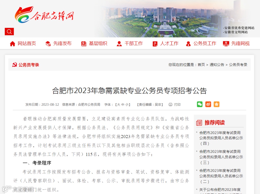 安徽合肥招录公务员公告
