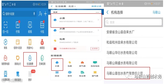 打开支付宝,选择生活缴费,点击水费,选择或新增缴费;如新增,需进行机构选择,选择马鞍山首创水务有限责任公司,输入用户号,完成缴费。