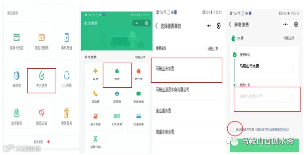 点击微信支付,选择生活缴费,选择水费,选择缴费单位(马鞍山市水费),输入缴费户号,勾选同意服务协议,确认缴费。