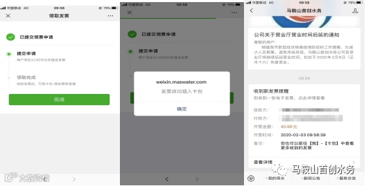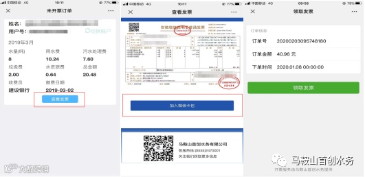 微信公众号可以绑定水费账号,选择“电子发票”,进入服务大厅,再选择“未开票订单”,查询到订单后,申请电子发票,通过“插入卡包”功能,将发票插入微信卡包,方便查阅。