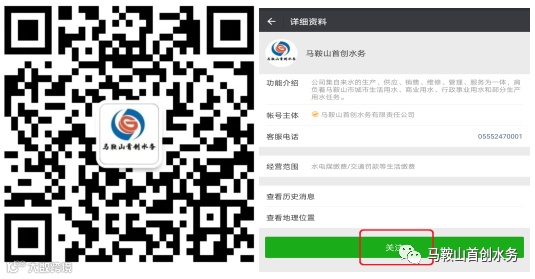 “一加”:打开微信扫描二维码(或搜索“马鞍山首创水务”),添加关注。