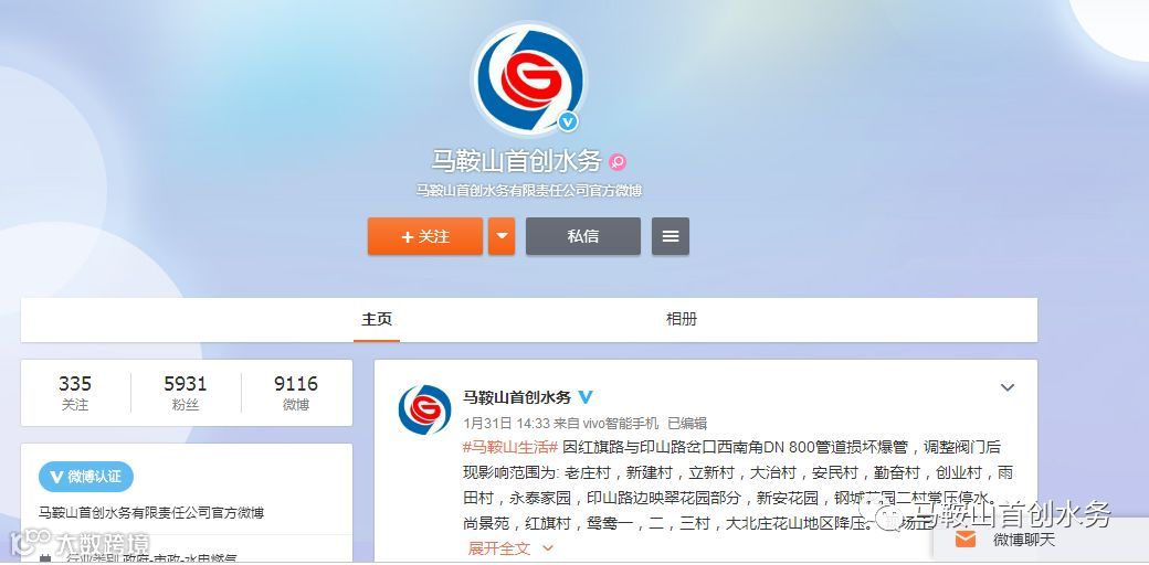 二、官方微博 新浪微博关注马鞍山首创水务
