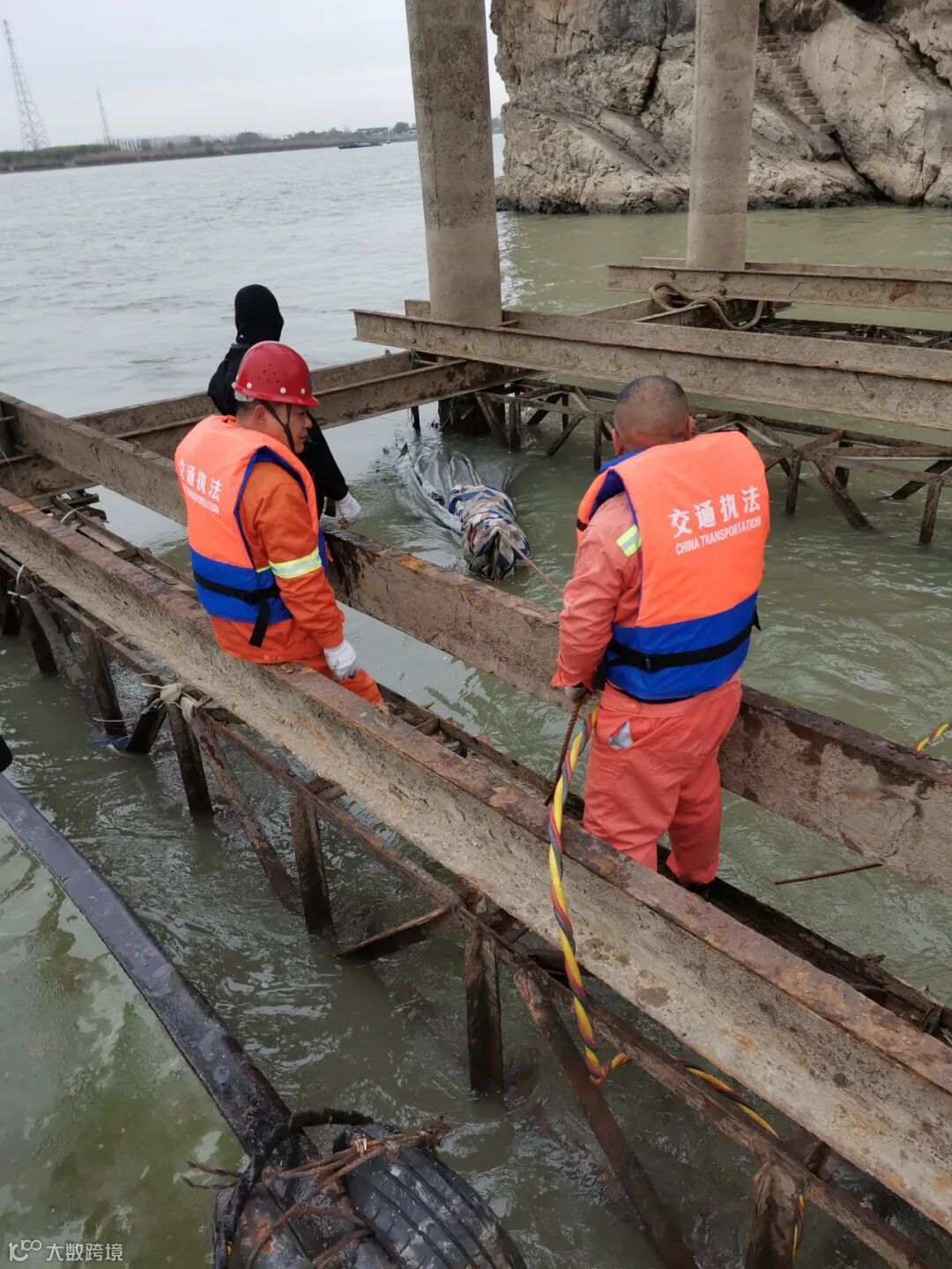 市住建局等政府相关部门的现场指导和协调帮助下,市交通运输综合行政执法支队支援的巡逻艇和专业机构潜水队伍第一
