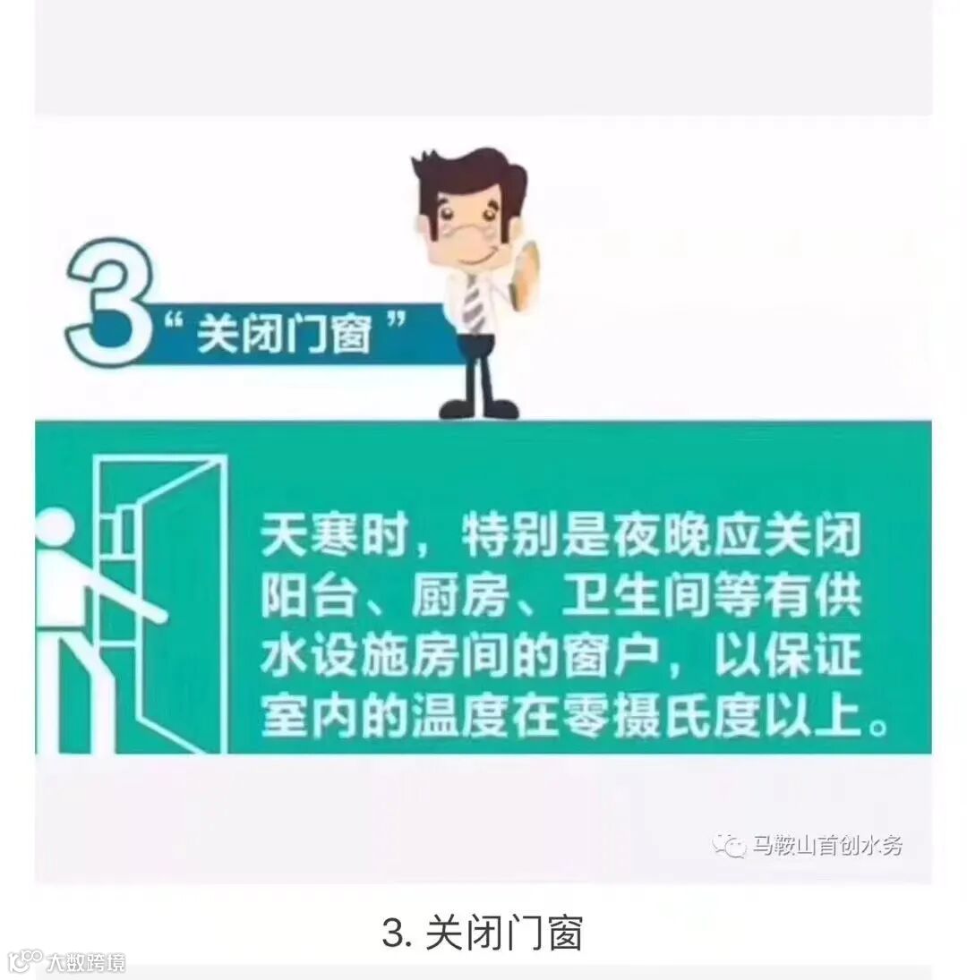 3.关闭门窗:在保证燃气和消防安全的前提下,关闭阳台、厨房、卫生间等有供水设施房间的门窗,防止透风,以保证室内温度在零摄氏度以上。