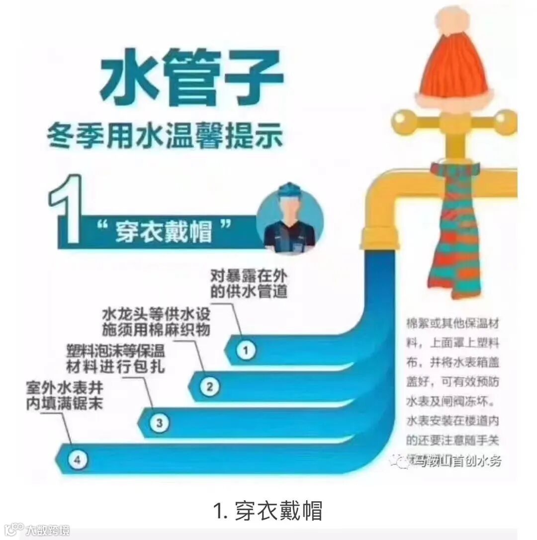 1.包裹保温:使用棉麻织物、保温棉或泡沫填充剂等材料,对水管、水表、阀门、水龙头等设施进行“穿衣戴帽”,力求包裹严实、保温防冻;高层用户在保证消防所需的前提下,还应将楼道门窗关闭,管廊井保持封闭状态。