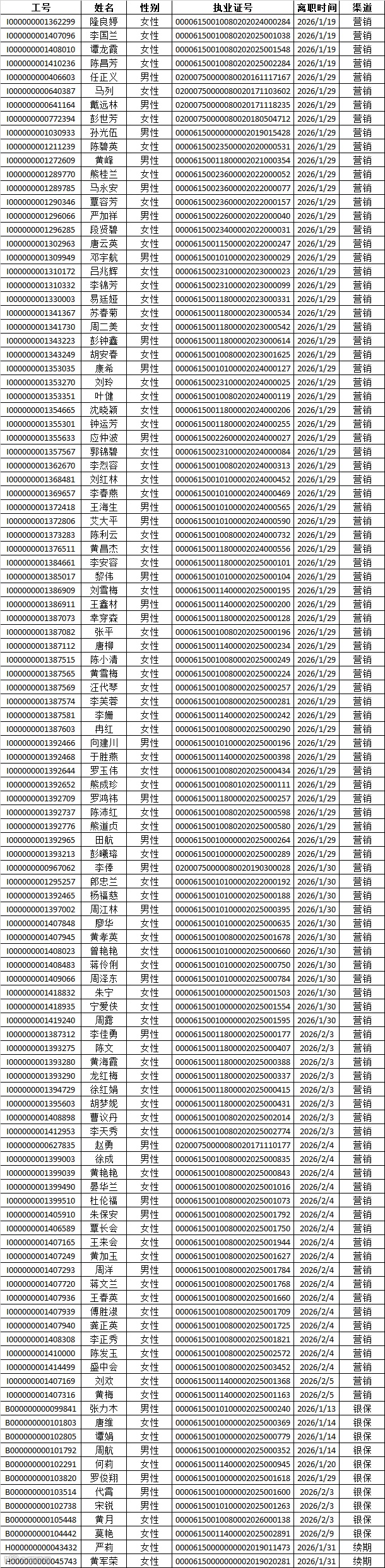 本次公示离职人员包含营销渠道100人,银保渠道10人,续期渠道12人,共计112人。公示的信息包含离职人员工号,姓名、性别、执业证号码以及离职时间。