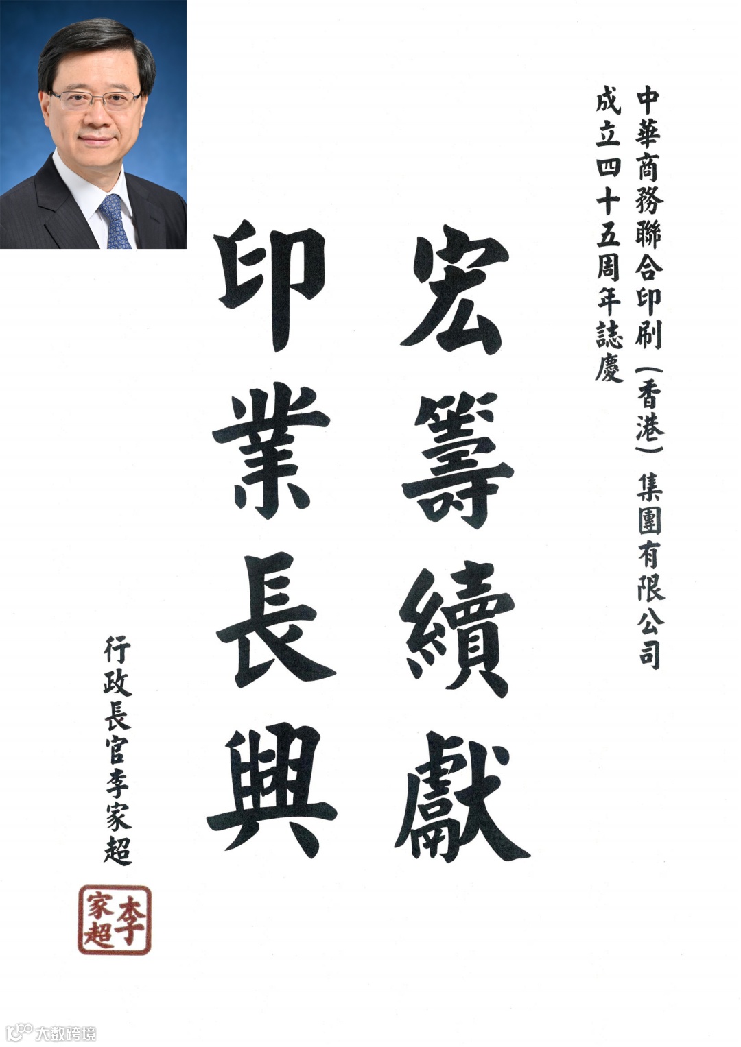 香港特別行政區行政長官李家超先生題詞「宏籌續獻 印業長興」,既是對中華商務四十五年來引領印刷產業升級的認可,亦寄寓扎根香港、服務國家的厚望。