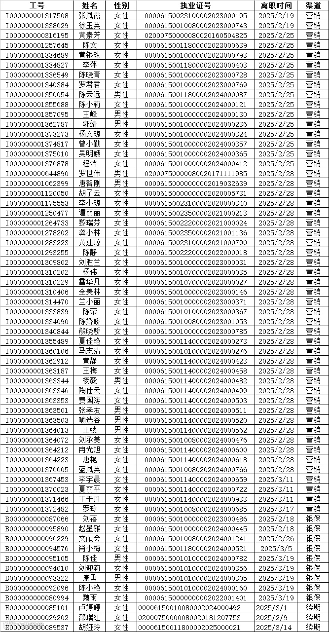 本次公示离职人员包含营销渠道51人,银保渠道9人,续期渠道3人,共计63人。公示的信息包含离职人员工号,姓名、性别、执业证号码以及离职时间。