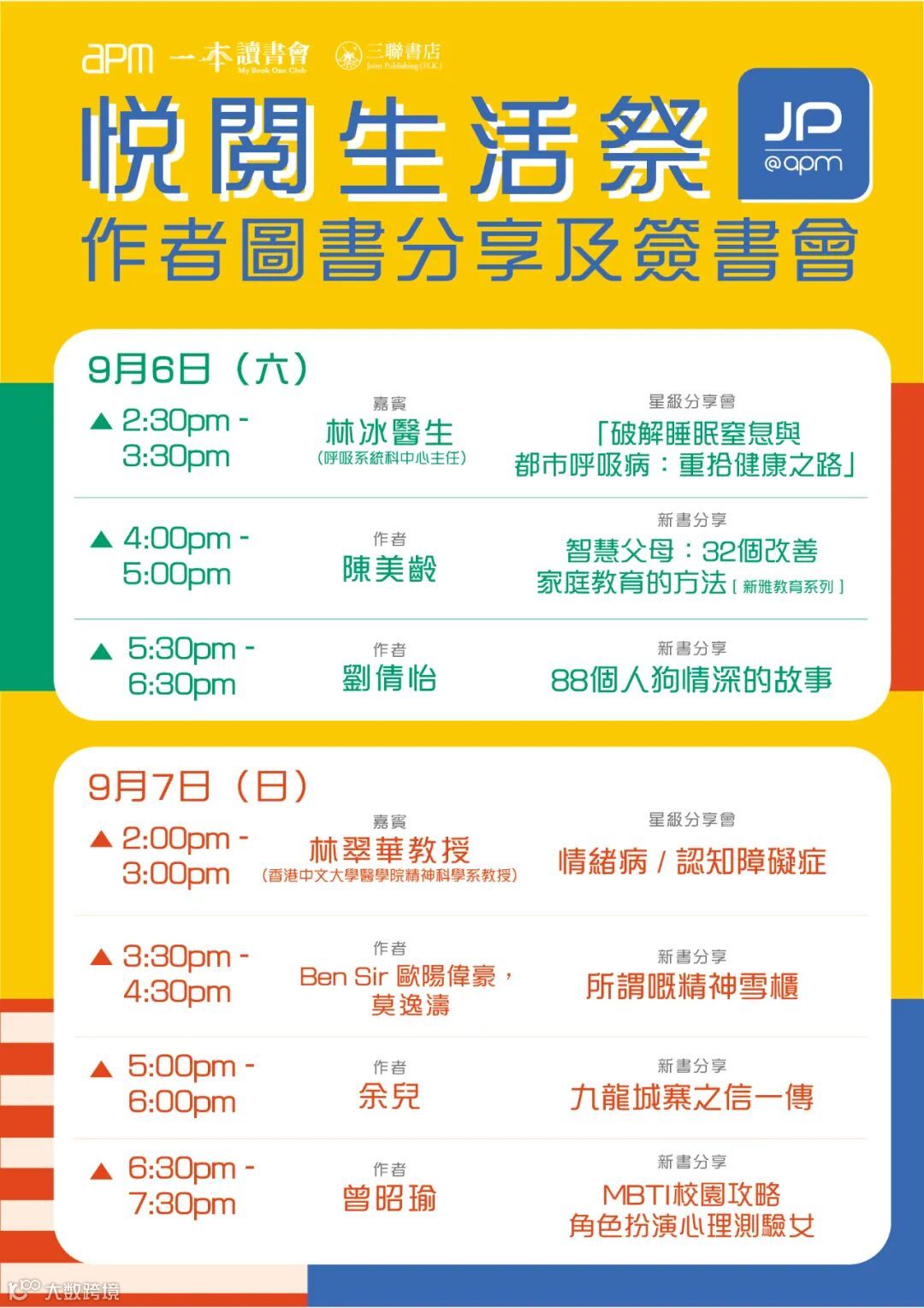 夜貓出動!即日起至9月12日每日中午12點到晚上11點,香港三聯書店在觀塘apm大堂舉行年度「達人夜書市——悅閱生活祭」,星期五六更延長到凌晨12點!