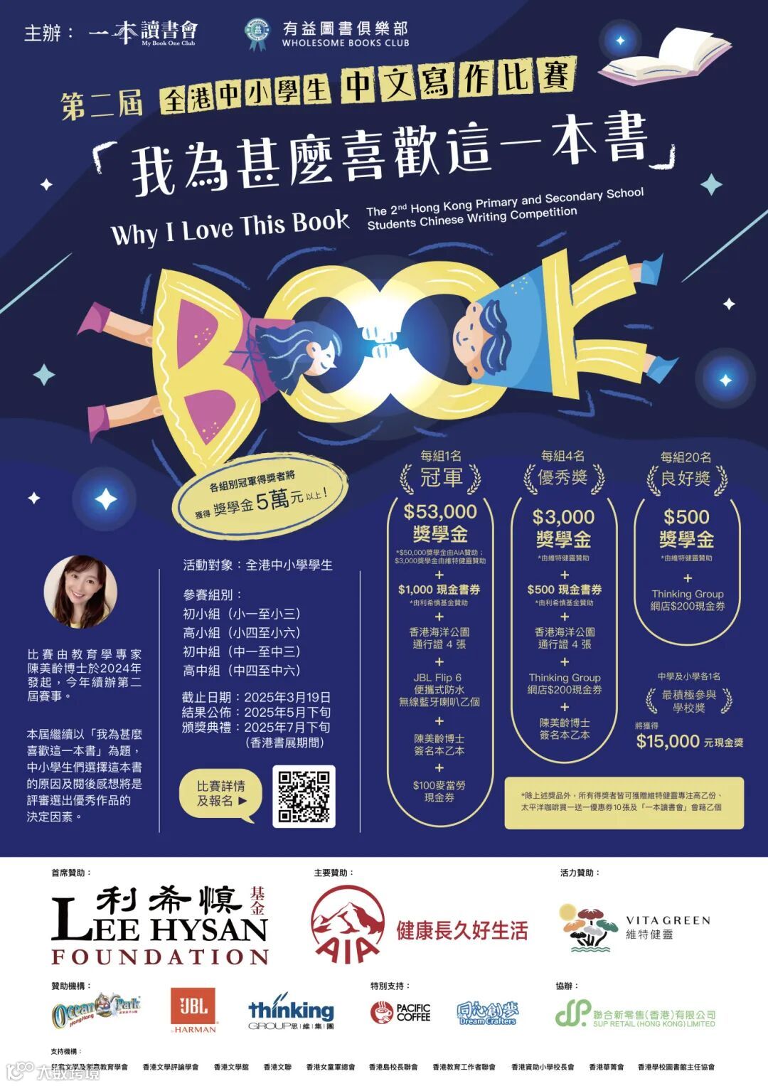 此項全港性學校寫作比賽由著名教育學專家陳美齡博士發起號召,旨在促進學生寫作與培養閱讀氣氛,首屆「我為甚麼喜歡這一本書」收到全港408間中小學校共10,388份參賽作品,受到學界和社會的熱烈迴響,為2024年首屆「香港全民閱讀日」拉開序幕。第二屆比賽繼續以「我為甚麼喜歡這一本書」為題,持續推廣校園閱讀,希望鼓勵學生繼續於書海中尋找一本啟發他們的書籍,並以寫作的方式表達對這本書的熱愛和感想。學生不僅可以在閱讀過程中接觸到不同的思想、觀點和文化,從而拓寬視野,增強表達能力;亦可促進學生建立持之以恆的閱讀習慣,促進在地文化社區與校園書香氛圍的形成。