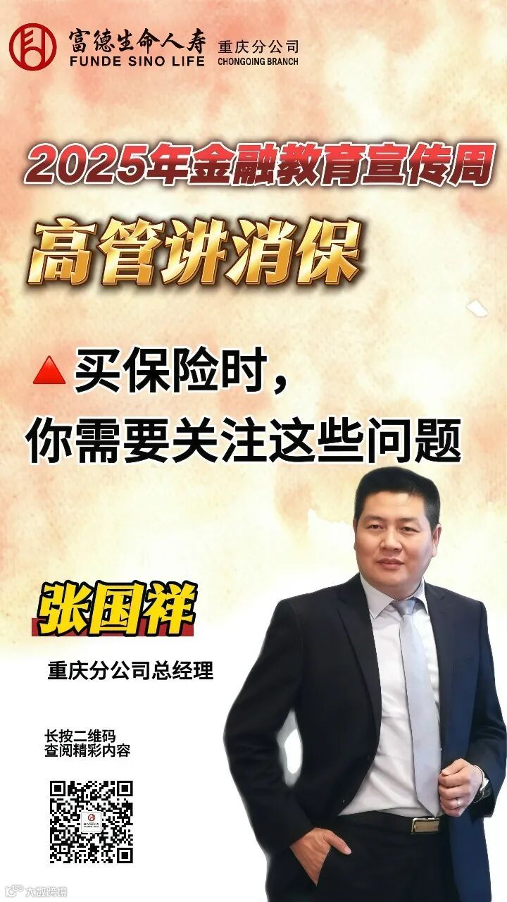 为深入贯彻落实2025年"金融教育宣传周"活动要求,切实提升消费者金融素养,富德生命人寿重庆分公司严格遵循监管工作指示,全面组织开展"高管讲消保"专题活动。重庆分公司将持续推进消费者权益保护工作走深走实,不断提升服务水平,为构建和谐金融环境贡献力量。
