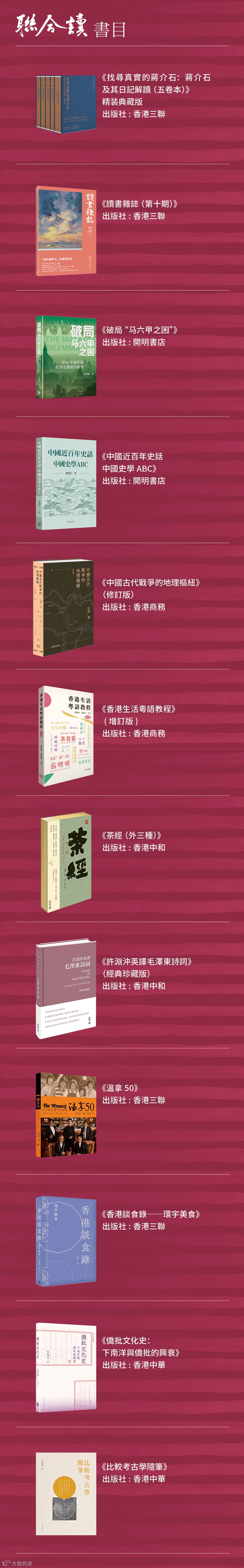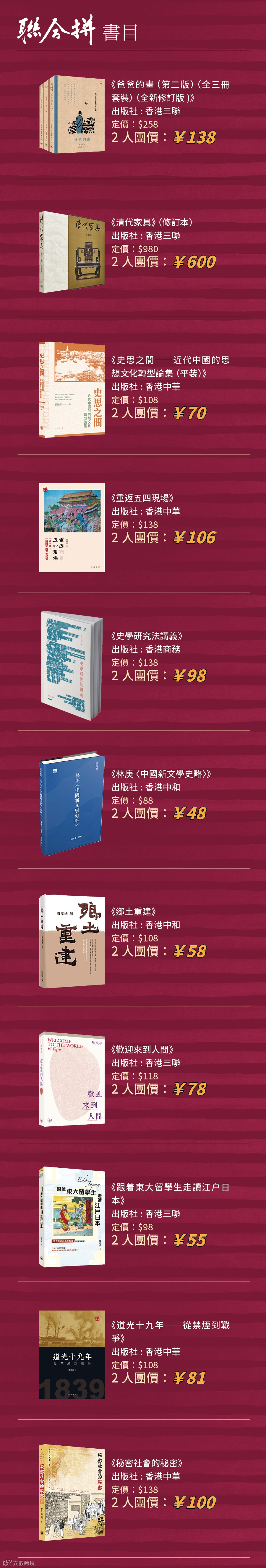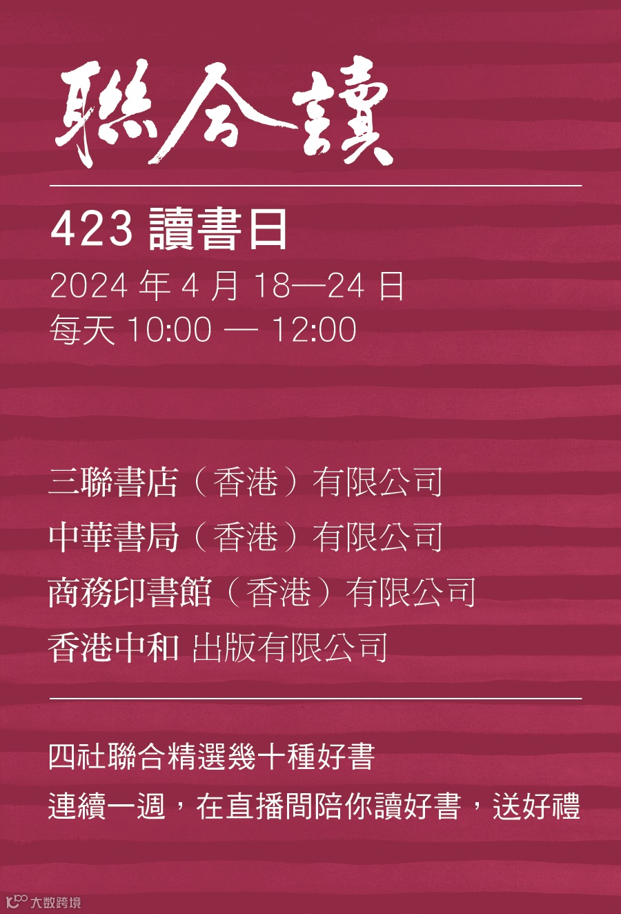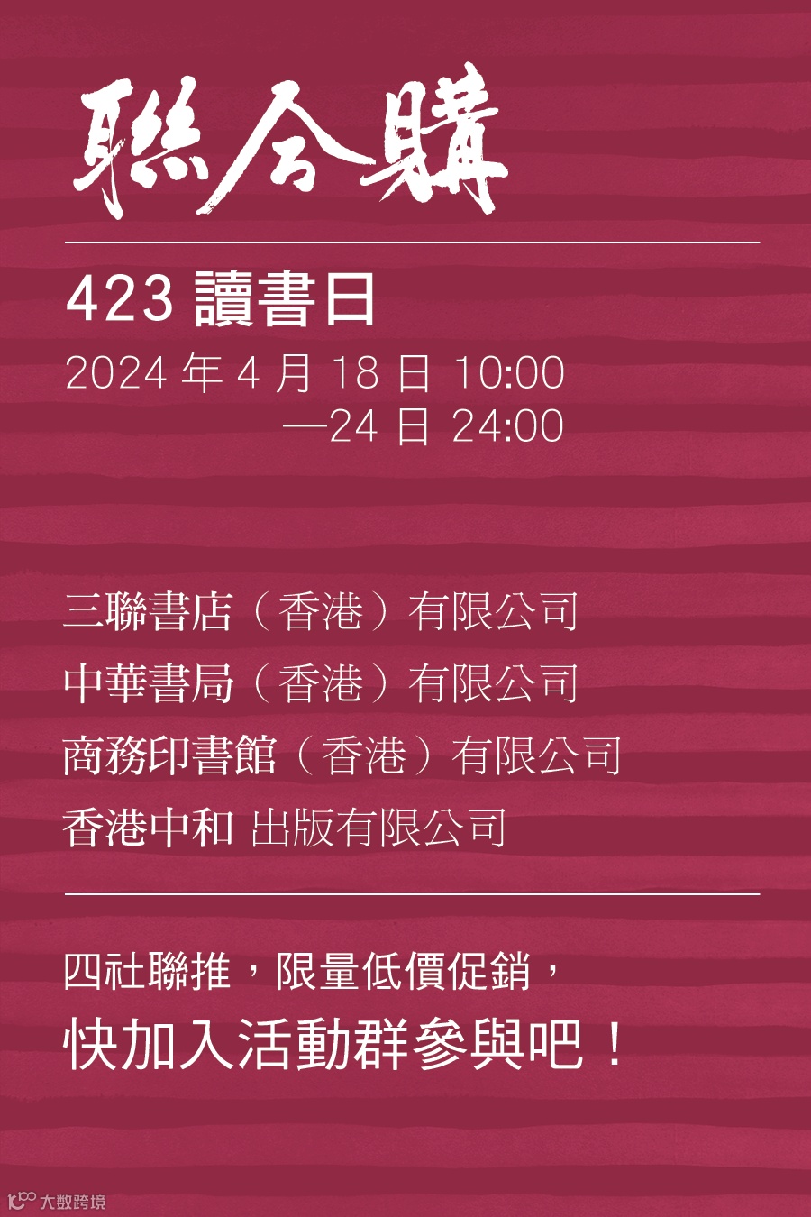 自2024年開始,香港特別行政區政府把每年4月23日的世界閱讀日定為「香港全民閱讀日」。4月18日—24日期間,聯合出版集團旗下香港三聯書店、香港中華書局、香港商務印書館、香港中和出版四家出版社,聯合推出「423讀書日 | 聯合讀·聯合購·聯合拼」系列活動,精選一批好書,以優惠購、拼團、直播的方式,邀你共讀!