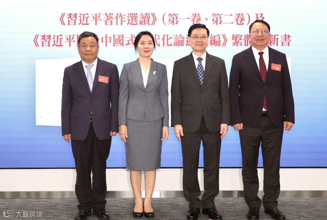 圖 | 新書揭幕儀式(左起:紫荊文化集團董事長許正中,中央政府駐港聯絡辦副主任盧新寧,香港特別行政區行政長官李家超,香港特別行政區政務司司長陳國基)