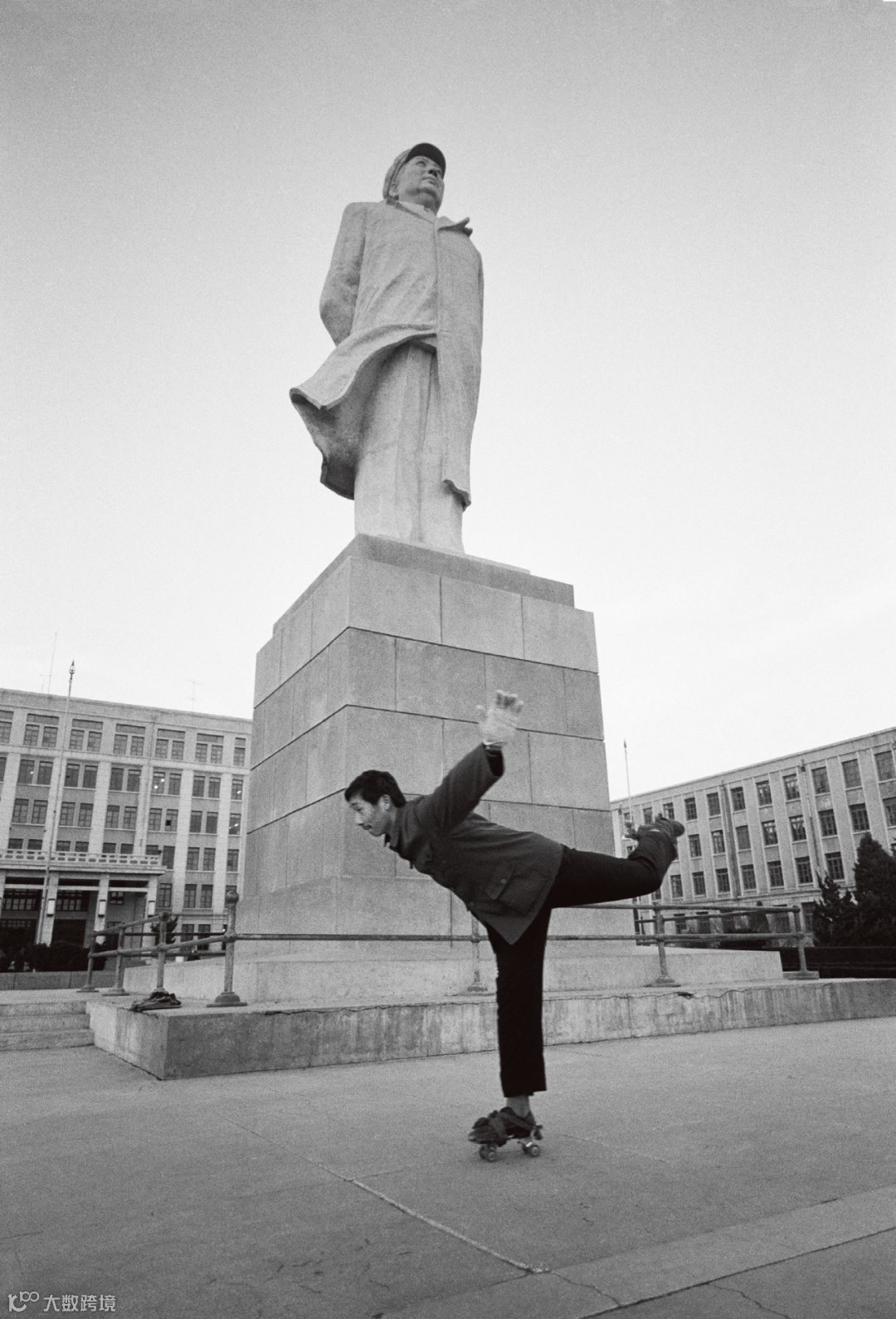 一個更複雜的例子涉及到1970年代之後的中國,當時國家正朝向新未來展望。對於劉香成來說,這是一個轉折點,但既不是通過新的辭藻或口號來呈現,也不是通過人們的言談或討論。相反,他透過人們不可模仿的肢體語言的變化來表現——在1976年的廣州街頭,一位戴着黑色臂章的男子正在打太極,而另一個人正疑惑地看着他,也許是對他的大膽感到困惑。同樣,在1981年,大連一位滑旱冰者繞着毛澤東雕像飛速滑行,清晰地暗示了一條通向未來的新道路。這些攝影作品中的人們可能無法說明在劉香成「看到」圖像那一瞬間,這些視覺上的並置所具有的特定含義。但敏銳如劉香成,在福州的童年時代已經親眼見證過毛澤東時期的中國,就會發覺影像中的人們在向他「講述」那個政治時代對人們的影響,這些影響如何滲透入日常生活,以及生活是如何變化的。