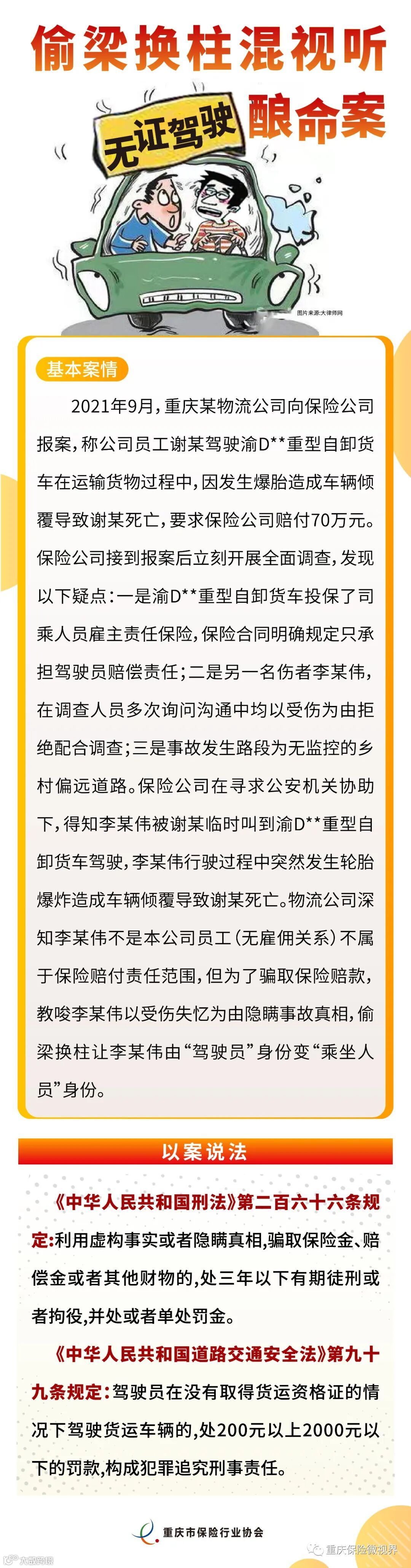 近年来,在重庆银保监局的指导下,重庆保险业积极构建反保险欺诈信息共享平台,强化大数据和科技手段应用,持续深入推进反保险欺诈工作,取得了较好工作成效。为进一步增强社会公众对保险欺诈严重性的认识,充分了解实施保险欺诈需要承担的法律后果,主动提升防范保险欺诈的风险意识,严厉打击保险欺诈违法犯罪行为,重庆市保险行业协会面向全市68家保险公司征集了2022年度保险反欺诈典型案例,结合社会影响、案件情节、作案手段、涉案金额及险种等多维度因素,最终评选出十起较为典型的反保险欺诈案例。