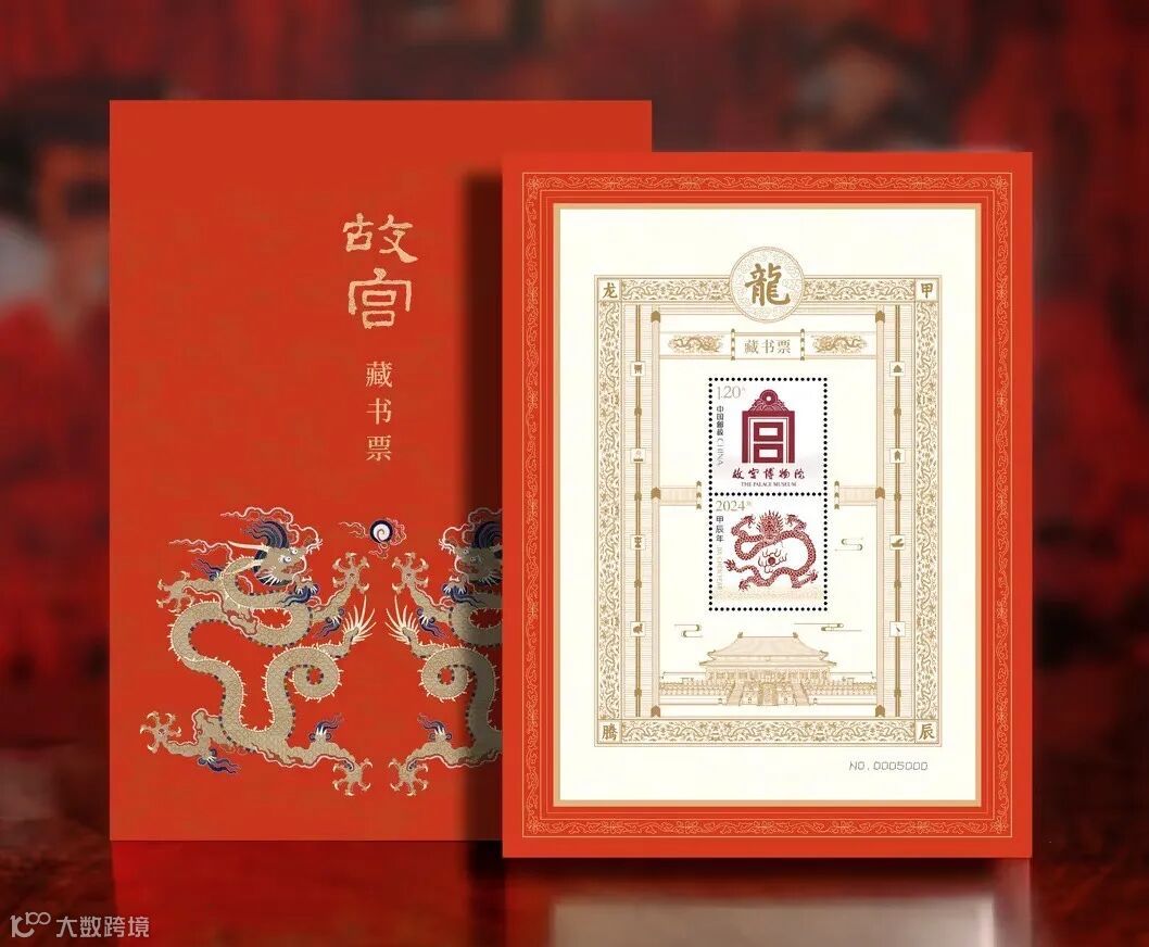 故宮博物院藏書票——甲辰龍騰以故宮博物院藏品的「龍」元素為設計靈感,圖案整體造型為「宮」字形,郵票是故宮九龍壁居中的正龍,龍身環曲,將火焰寶珠托於頭下;邊飾是太和殿線稿、填漆戧金雙龍戲珠紋供桌紋樣;「龍」字採用建福宮咸豐帝御筆紙地墨字「飛龍在天」匾。