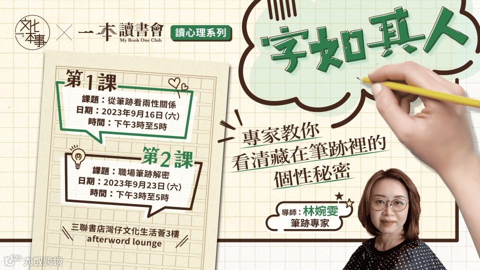 俗話說人如其字,見字如見人,縱然今日寫字機會比往日少,可是筆尖在紙上留下的痕跡,還是能觀照執筆者落筆一刻情緒,甚至從筆跡知道其性格。筆跡分析專家林婉雯告訴我們,觀字就知情場與職場之「命運」。想了解自己與身邊人藏在筆跡裡的個性秘密嗎?快來參加這2節由「文化本事」與「一本讀書會」合辦的工作坊吧~