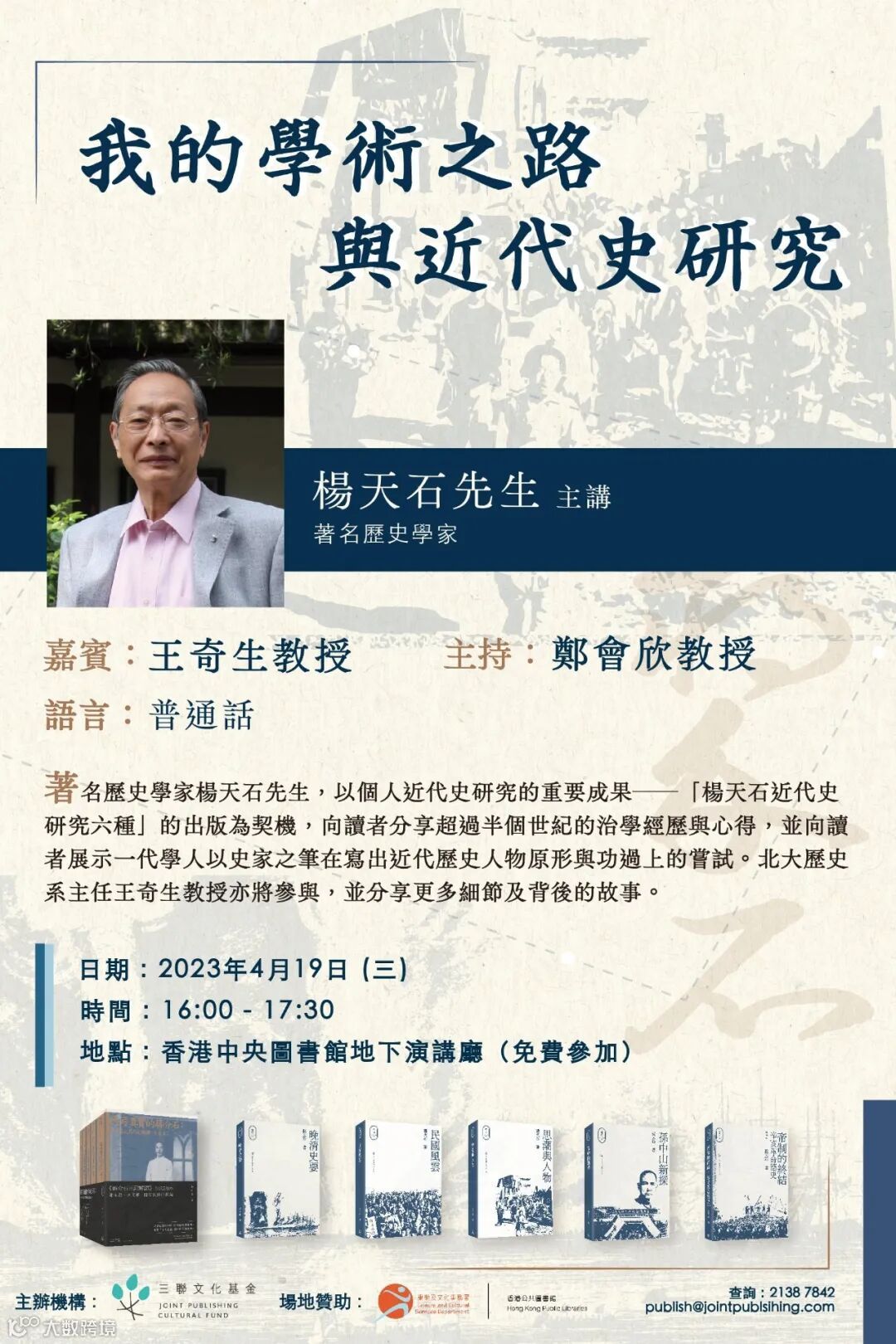 下周三楊天石教授將親臨香港中央圖書館,為廣大讀者講述「我的學術之路與近代史研究」。