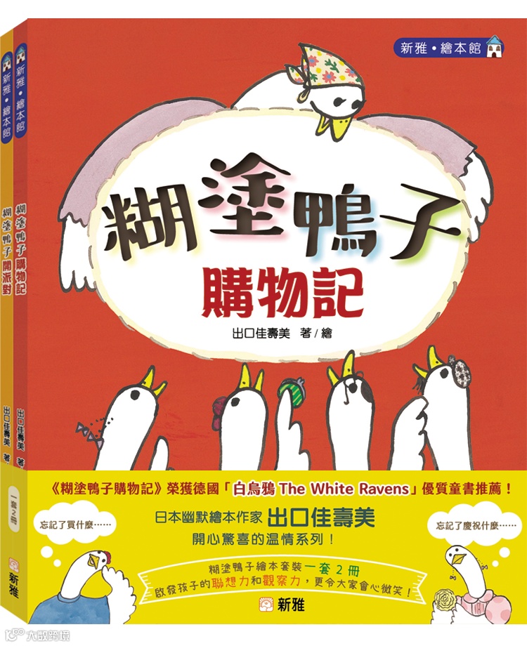 本系列一套共2冊,包括《糊塗鴨子購物記》及《糊塗鴨子開派對》。傻傻的動物角色,帶出幽默又温馨的故事;猜謎式的情節配合繽紛有趣的圖畫,還可以啟發孩子的聯想力和觀察力。大家一起來猜猜結局吧!