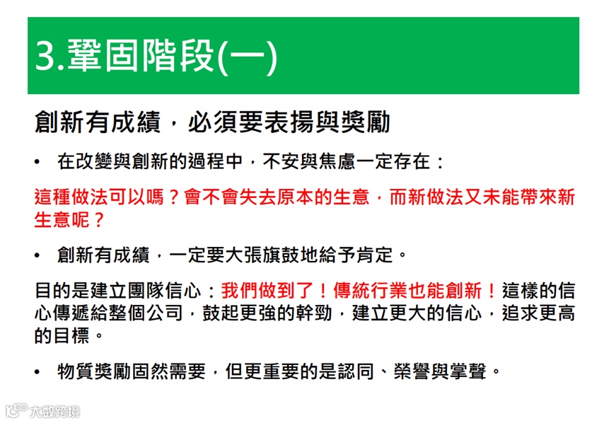 在鞏固階段,她認為對於創新有成績必須要進行表揚和獎勵,目標是建立團隊的信心,要通過大張旗鼓的獎勵方式來將信心傳遞給整個公司,鼓起更強的幹勁,建立更大的信心。