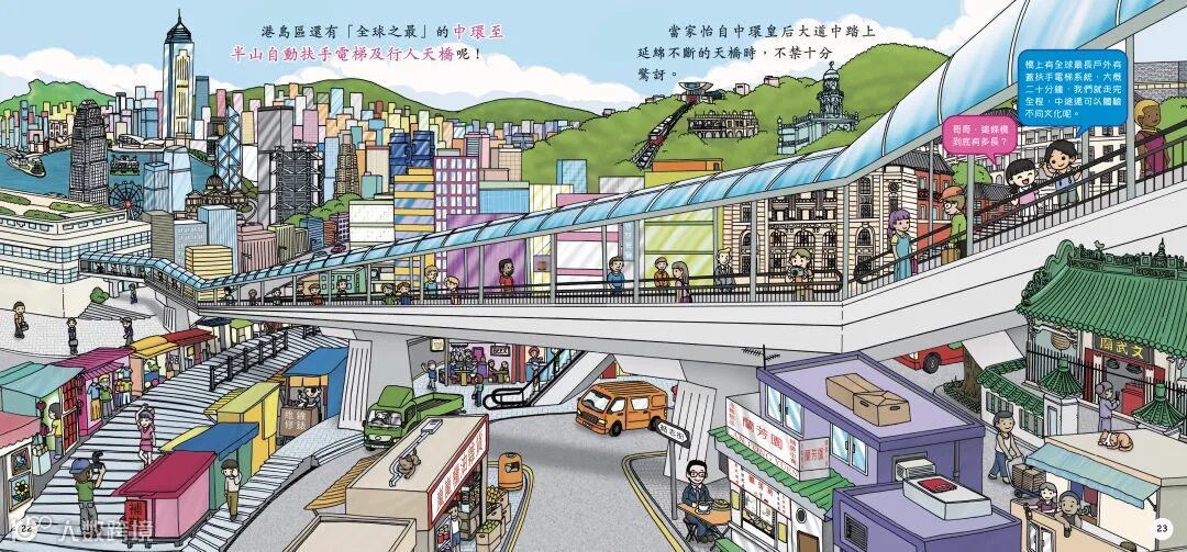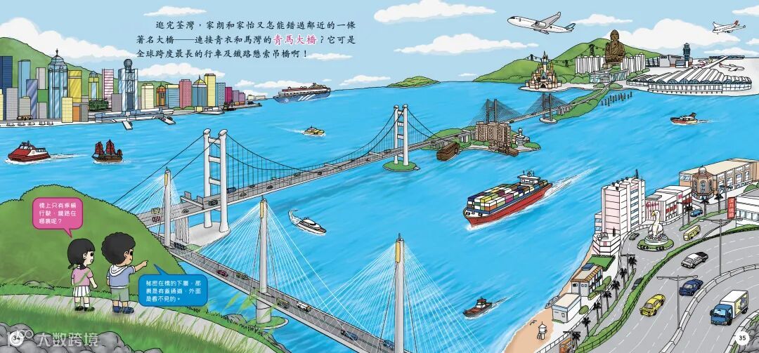 細細想來,香港這個彈丸之地原來有不少了不起的、享譽國際的橋樑呢!家長與孩子閱讀這本書時,還可以一起玩找找看,利用書中6張精彩的跨頁橋景圖找出多個地標(仔細找的話,可以找出超過65個以上呢!),跟孩子說說這些地標的功能和背後故事。