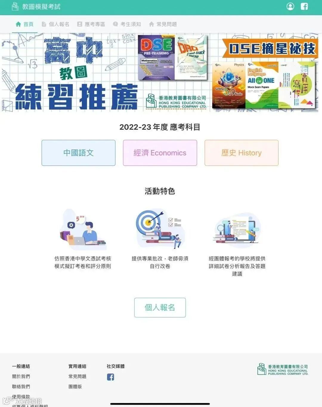 為配合模擬試卷市場拓展,香港教育圖書開發網上系統,以網站形式電子化收費、交卷、評核、派發報告等4大流程。實現減省學校收取報名費的工作、收卷工作,同時,可於考生網上交卷後即時進行批卷,加快批改流程。還可以於線上自動發放專為學生提供的「學生成績報告」,讓考生了解考試表現,以及於線上按學校自動發放該校全部考生的「整體分析報告」及「答題建議」協助老師掌握全體考生考試情況。