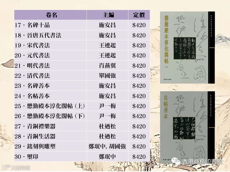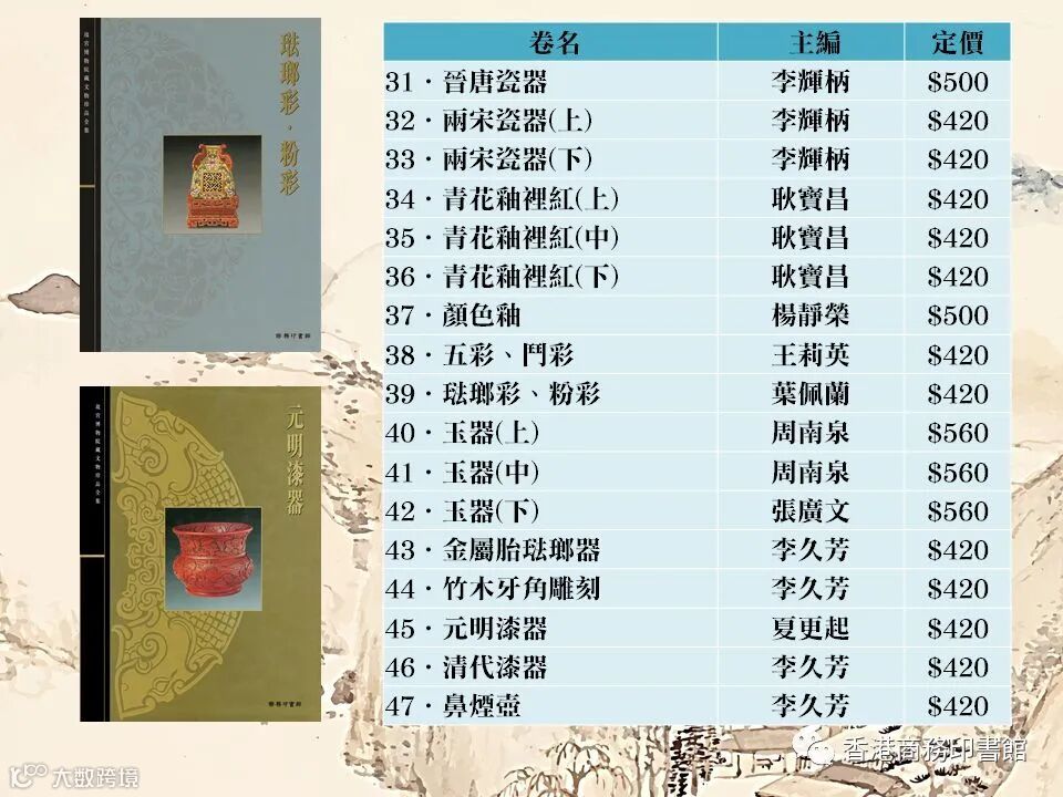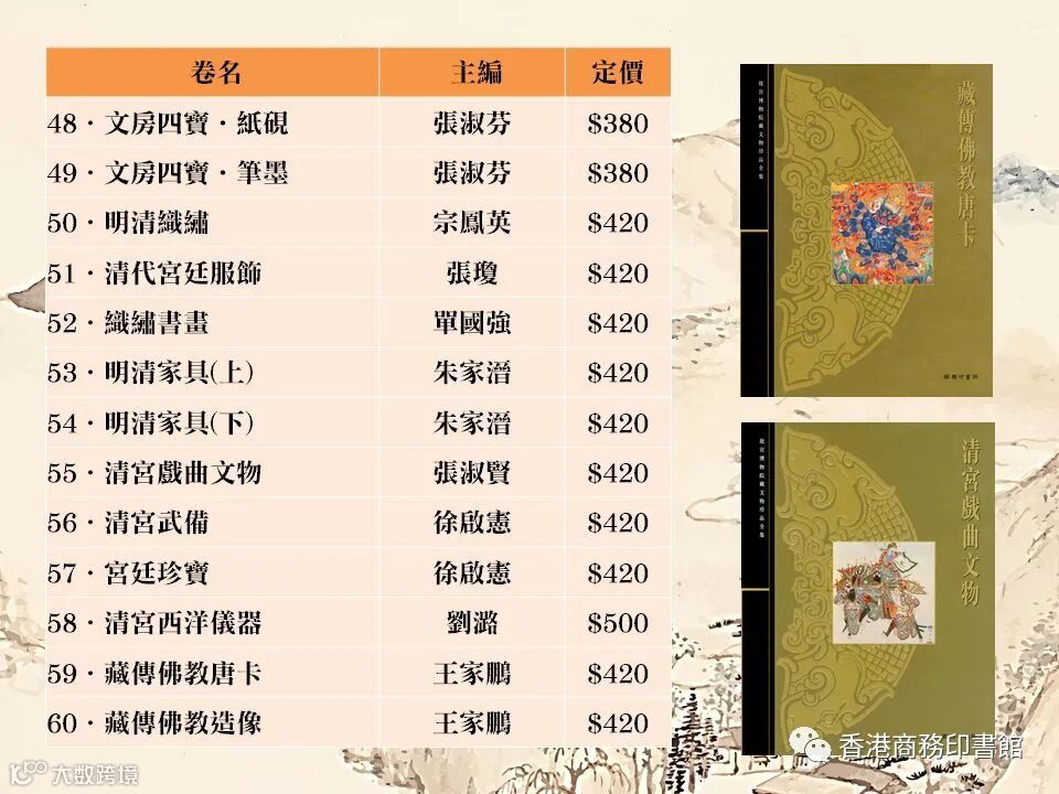 能親睹故宮博物院藏品的機會不多,公開展出的數量也極有限。《故宮博物院藏文物精品集》六十卷中文版以及十卷英文版是目前可以代表故宮博物院的英文版大型畫冊,精選出過萬件珍藏文物,包括明清五百年的皇室收藏以及罕為人知的新近出土的文物珍品。