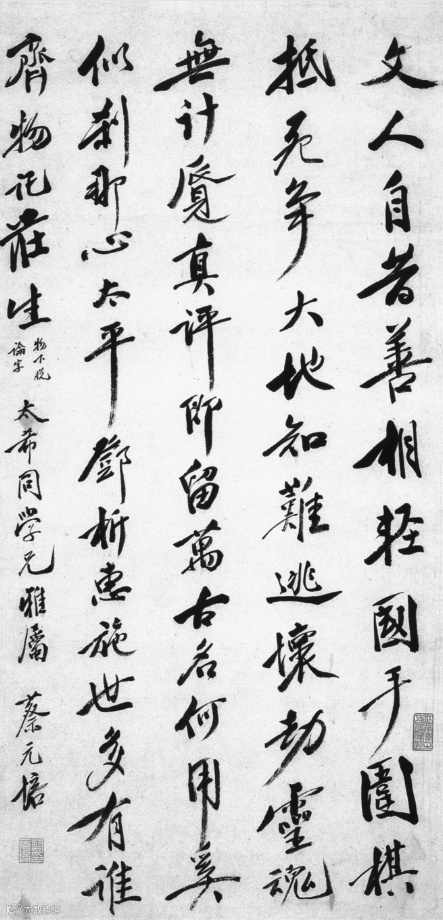 文人書法,這是個有趣的選題。它似乎有別於專業書家的書法,而是以凸現文人個性文化、注重趣味和書卷氣的一種書法。也許它的點畫還不夠精到,章法、筆墨也無刻意的安排和講究,但因為有了上述因素,字裏行間也就意味盎然了。