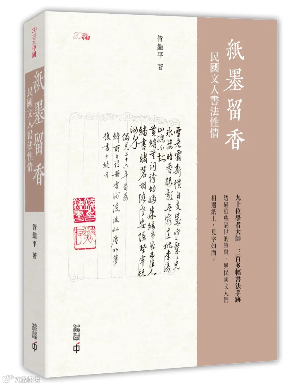 香港中和出版新推出的《紙墨留香:民國文人書法性情》,由上海市書法家協會常務理事管繼平老師所著,篇篇美文生動感性地講述90位民國文人大師有趣的生平軼事與交遊故事,附300多幅墨跡珍品圖片,專業功底分析文人書法特點。