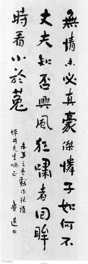 他早年在日本時,即從章太炎先生聽文字學;剛到北京教育部做事時,生活沉寂得很,每天下班則躲進書屋長時間地抄寫古碑,並熱衷於搜尋碑帖拓片,不斷地描摹整理。從1913年一直到1936年8月臨終前兩個月,僅據《魯迅日記》中所列歷年「書賬」作粗略統計,他持續所搜集的金石拓本(包括漢畫像石拓片)總數已達5800多張!所以,魯迅先生對書法、美術有着極高的鑒賞力,對篆、隸、章草等各種書體,均可熟練掌握。難怪他曾對友人表示「字不好」,但「寫出來的字沒甚麼毛病」,顯示出他在文字學上的相當自信。所以他有時書興濃時,時常會將一兩個篆隸意的字參雜於行書之中,渾然一體,趣味橫生。