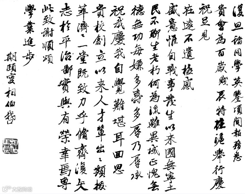 我在《復旦大學檔案館館藏名人手札選》(復旦大學出版社1997年出版)一書中,開卷首篇便讀到老校長馬相伯的翰墨。這是1939年4月,復旦全體師生為老校長的百齡壽誕而舉辦慶祝活動,老人獲悉後而書寫的答謝辭。這通書札馬相伯的落款是「期頤叟相伯啟」,儘管已是百歲高齡,儘管只是兩頁書札體,但老人卻是以稍帶行書筆意的楷體,寫得一筆不苟!馬相伯先生過了百歲生日後,卒於1939年11月4日,也就是說距寫這一幅書札僅半年左右的時間。然而即便為暮年之書,雖有蒼古凝練之意,卻絲毫不見龍鍾顫巍之態。而且其線條之工穩、法度之謹嚴簡直無可挑剔,這實乃罕見其匹也。
