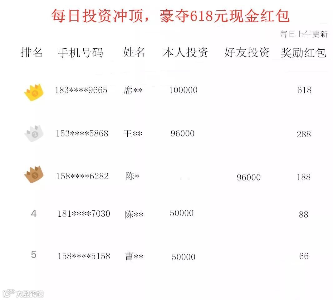 活动期间内,每天,后台将计算当日0点至24点您及您邀请的好友的投资金额之和进行实时排名,每日综合排名前5名将获得现金红包奖励,当日排行榜红包奖励将于次日发送至您账户中。