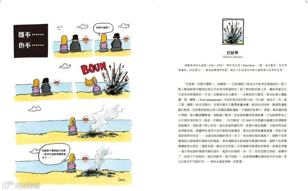 此外,法式哲學漫畫的幽默感和日式的哲學普及類讀物在精神氣質上有着根本的不同。儘管日本人在這類作品中也會調侃搞笑,但是法國人的諷刺力度更大,也更加犀利。哲學在他們看來不是權威,毋寧說反對權威的哲學對他們來說更有吸引力,這正是福柯主義、解構主義、後現代思潮等質疑權威的思想對法國人來說更有吸引力的原因。