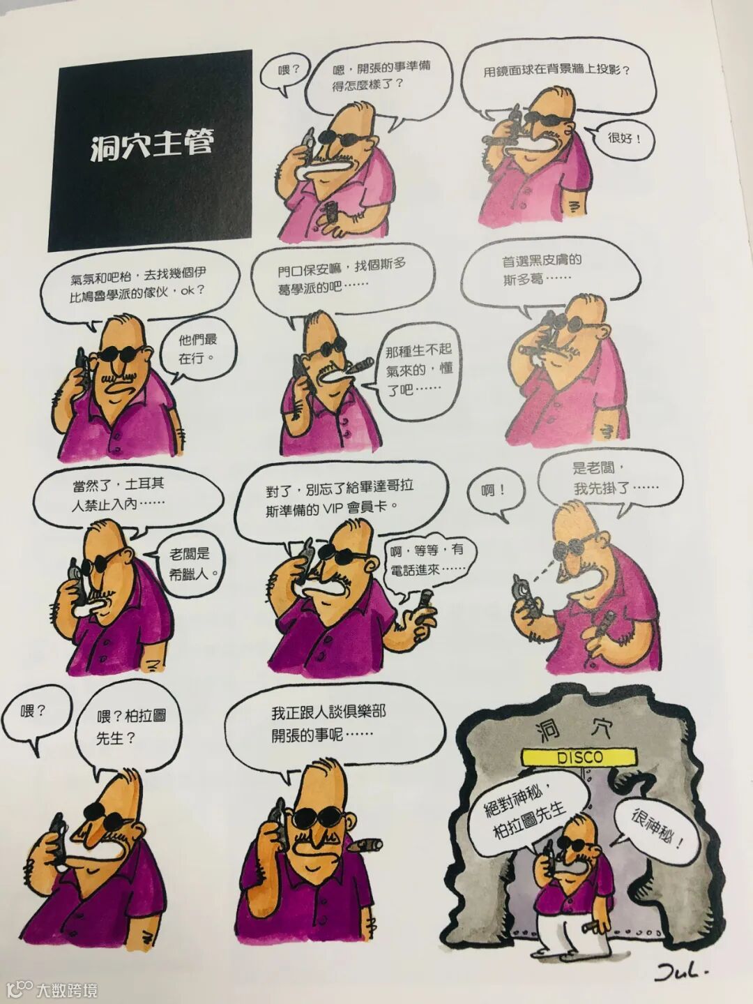 在左邊的漫畫中,一個經紀人模樣的人在通電話,安排舞廳人員分配的事宜。他吩咐伊壁鳩魯的人去負責氣氛和吧台,讓斯多葛學派的人擔任保安,而且要選黑皮膚的斯多葛學派,禁止土耳其人進入,還要給畢達哥拉斯準備vip會員卡。掛了電話,他接到了老闆柏拉圖的電話,背景顯露出他站在一個名為「洞穴」的酒吧門口,並且他向柏拉圖保證說,這個舞廳絕對非常神秘。
