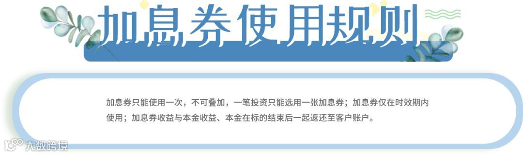 活动期间全民财富平台将对所有投资客户赠送加息券,投资满一定金额,即可使用相应的加息券扩大收益,最高可享1%的加息年化收益。(加息比例及可使用额度参考如下图:)