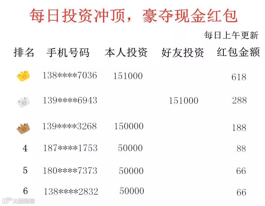 平台对每日投资者及其邀请的好友的投资金额之和进行实时排名,每日综合排名前5名将获得现金红包奖励。