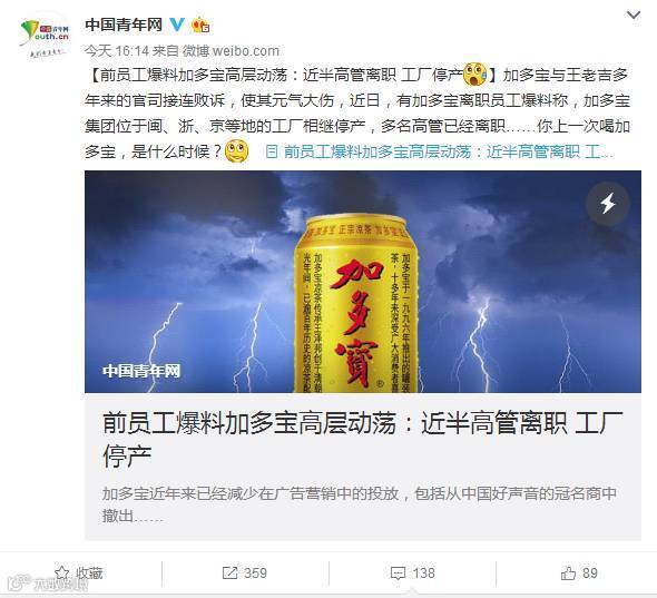 导读:近日,中国青年网爆出,加多宝多名高管离职,放弃部分生产线消息。