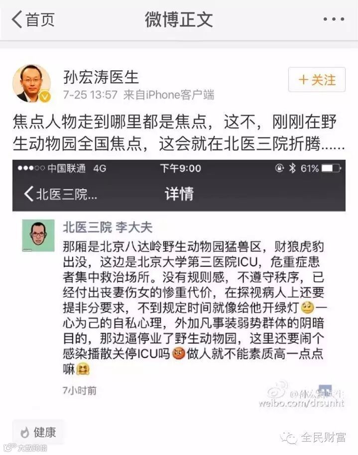微博上一认证孙宏涛医生爆料,