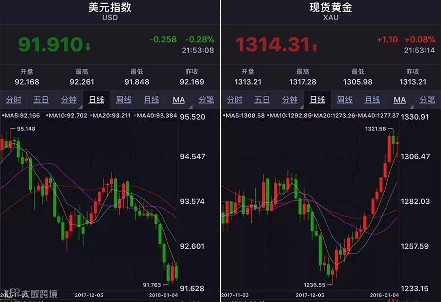 8、【美元指数、现货黄金】截至2018-01-04,21:53