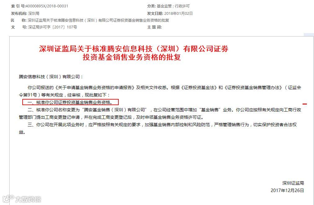 3、【腾讯获得基金销售牌照,互联网金融布局再下一城】1月2日,深圳证监局发布关于核准腾安信息科技(深圳)有限公司证券投资基金销售业务资格的批复,核准腾安科技证券投资基金销售业务资格。腾安科技推出的产品包括腾讯理财通。中国基金报消息称,腾安科技公司以腾讯集团理财通平台为基础,将逐步开展独立基金销售业务服务。在微信端,近10亿微信活跃用户未来买基金可能更加简单和便捷。金融牌照最齐全的互联网公司之一虽然主业不在金融领域,但腾讯已成为金融牌照最齐全的互联网公司之一。【全天候科技】