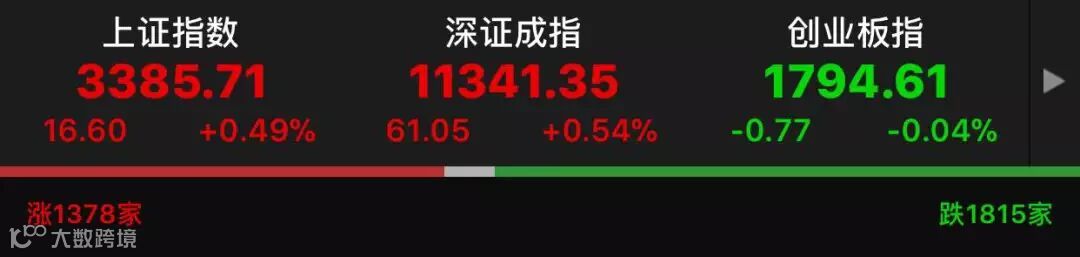 1、【收评】周四,大盘震荡走高,沪指冲击3400点未果收窄涨幅,创业板小幅调整。截至收盘,沪指涨0.49%,报3385.71点;深指涨0.54%,报11341.35点;创业板指数跌0.04%,报1794.61点。板块方面,石油酿酒板块涨幅居前,保险、天然气板块走弱。可燃冰、草甘膦、石墨烯概念活跃,国产软件、黄金概念低迷。(网易财经)