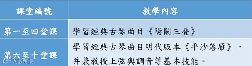 培訓内容:適合已完成古琴入門課程的學生,將以十堂課為階段,學習經典古琴曲目明代古曲《平沙落雁》,以及嶺南派古琴曲《雙鶴聽泉》,古人有所謂「一曲平沙走天下」之説,即指此曲而言。