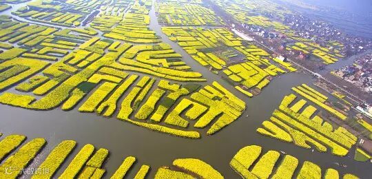 放眼望去,一片片灿烂金黄的油菜花田镶嵌在绿色的麦田之间,麦田又星罗棋布地分散在百转曲折的小河湖泊中,耀眼奔放。